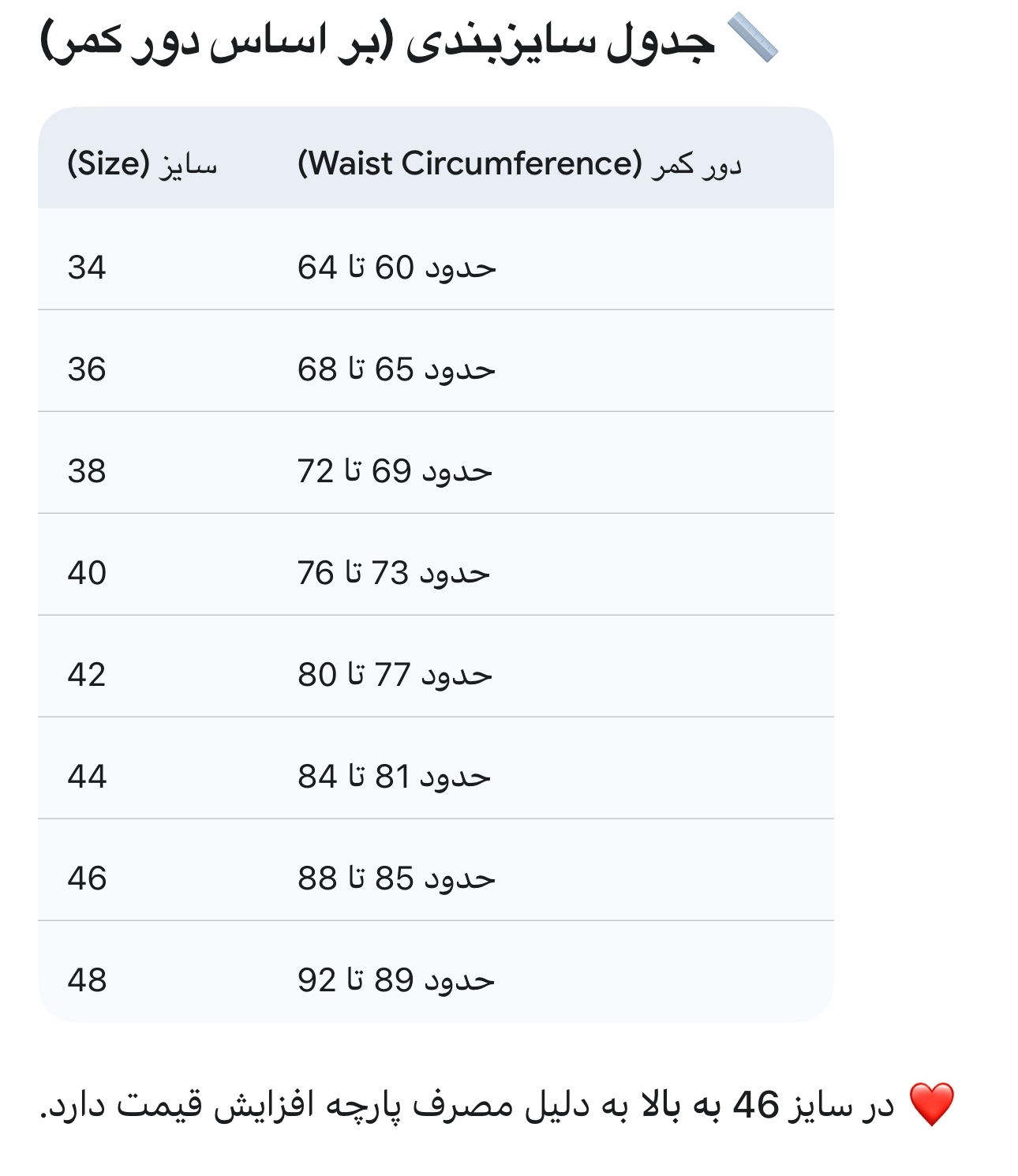 • ابعاد و اندازهها: باتوجه به دوخت دست اندازههای درج شده (مانند قد کار، دور سینه و ...) ممکن است اختلاف ۱ الی ۲ سانتیمتر در تولید وجود داشته باشد