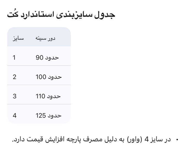 • ابعاد و اندازهها: باتوجه به دوخت دست اندازههای درج شده (مانند قد کار، دور سینه و ...) ممکن است اختلاف ۱ الی ۲ سانتیمتر در تولید وجود داشته باشد