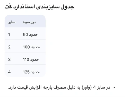 • ابعاد و اندازهها: باتوجه به دوخت دست اندازههای درج شده (مانند قد کار، دور سینه و ...) ممکن است اختلاف ۱ الی ۲ سانتیمتر در تولید وجود داشته باشد