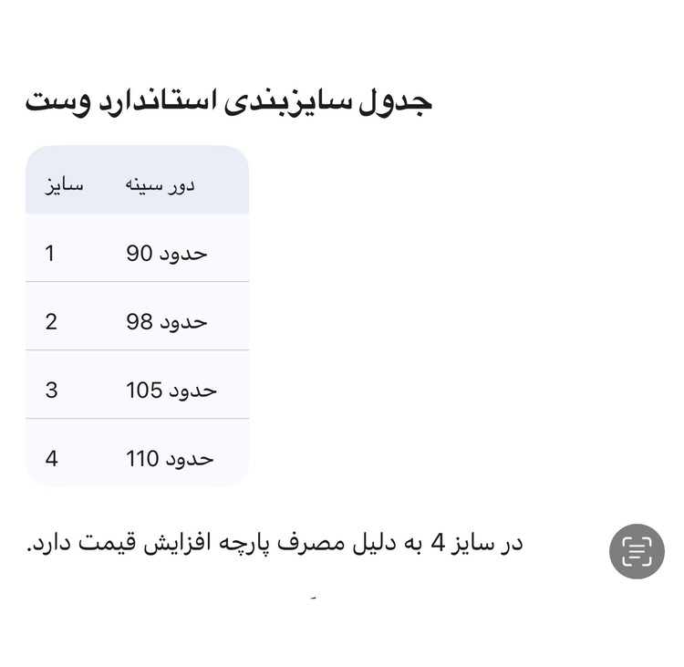 • ابعاد و اندازهها: باتوجه به دوخت دست اندازههای درج شده (مانند قد کار، دور سینه و ...) ممکن است اختلاف ۱ الی ۲ سانتیمتر در تولید وجود داشته باشد